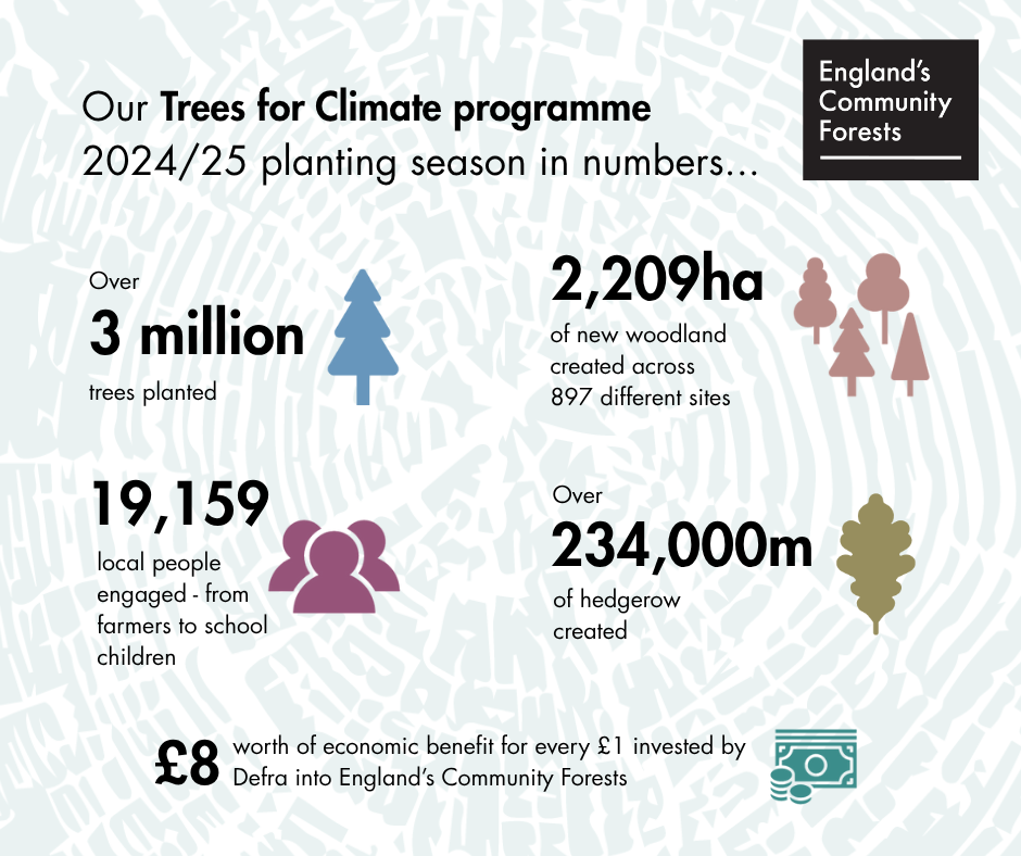 Across England’s Community Forests, planting figures continue to reflect the collective effort of the network, with a record 3.1 million trees planted to boost woodland creation across the country during the 2024/25 season.